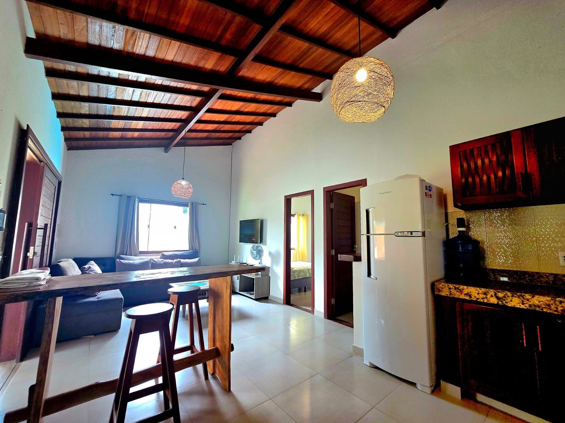 Temos sala com TV, Cozinha equipada com o básico.