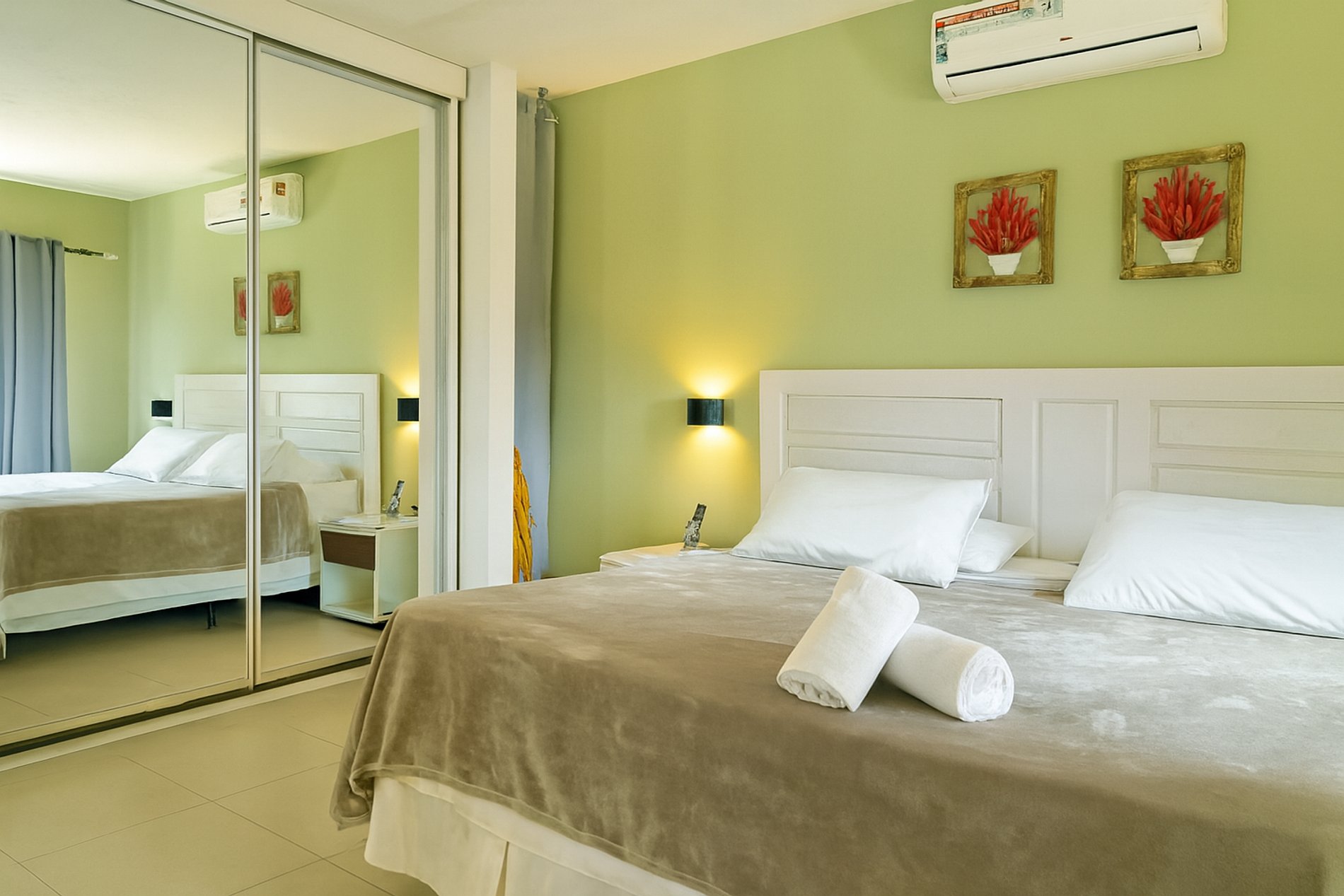 QUARTO MODERNO, AMPLO E CONFORTÁVEL: equipado com ar condicionado split e smartv.