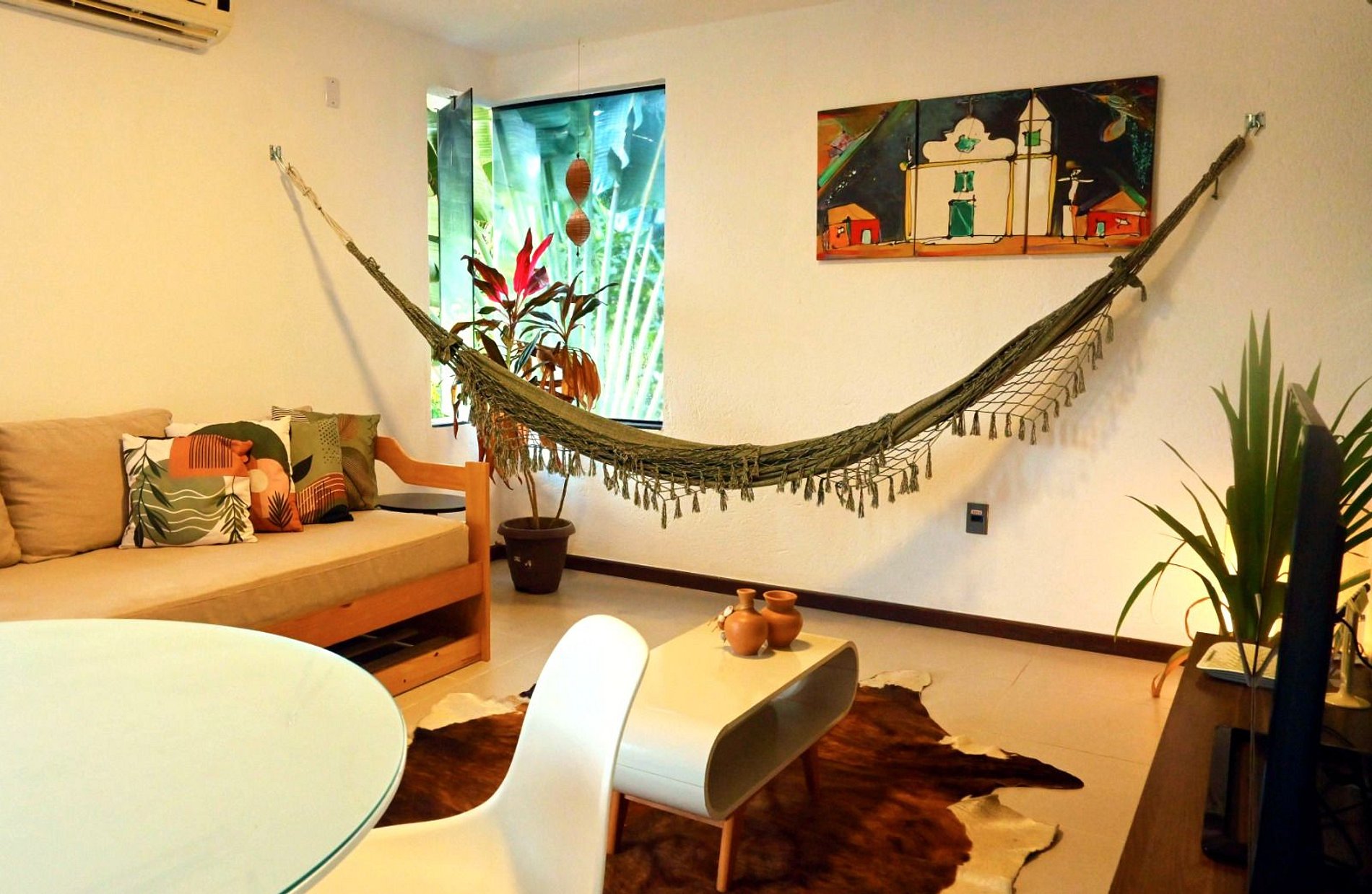 SALA COM AR CONDICIONADO, TV E SOFÁ CAMA.