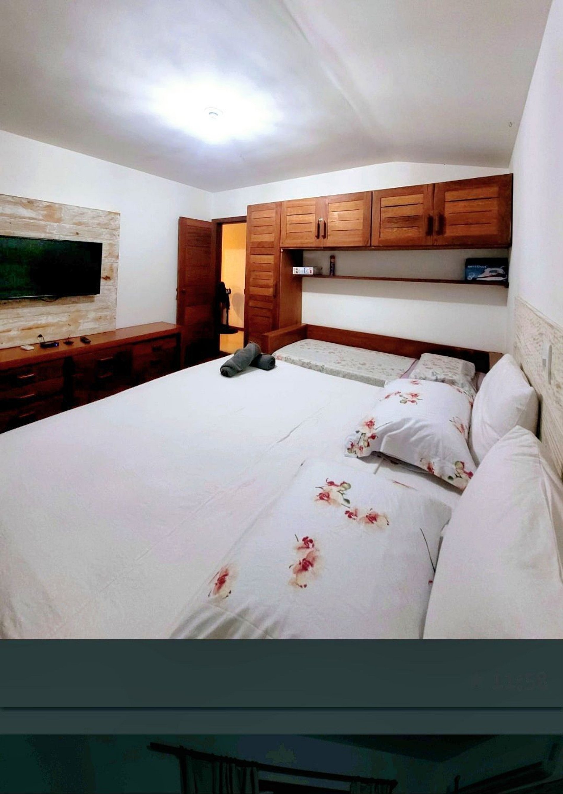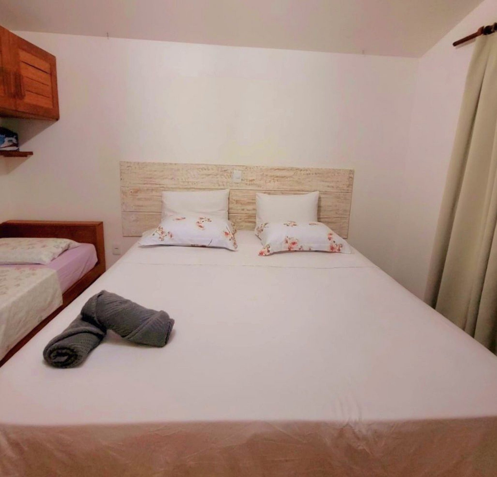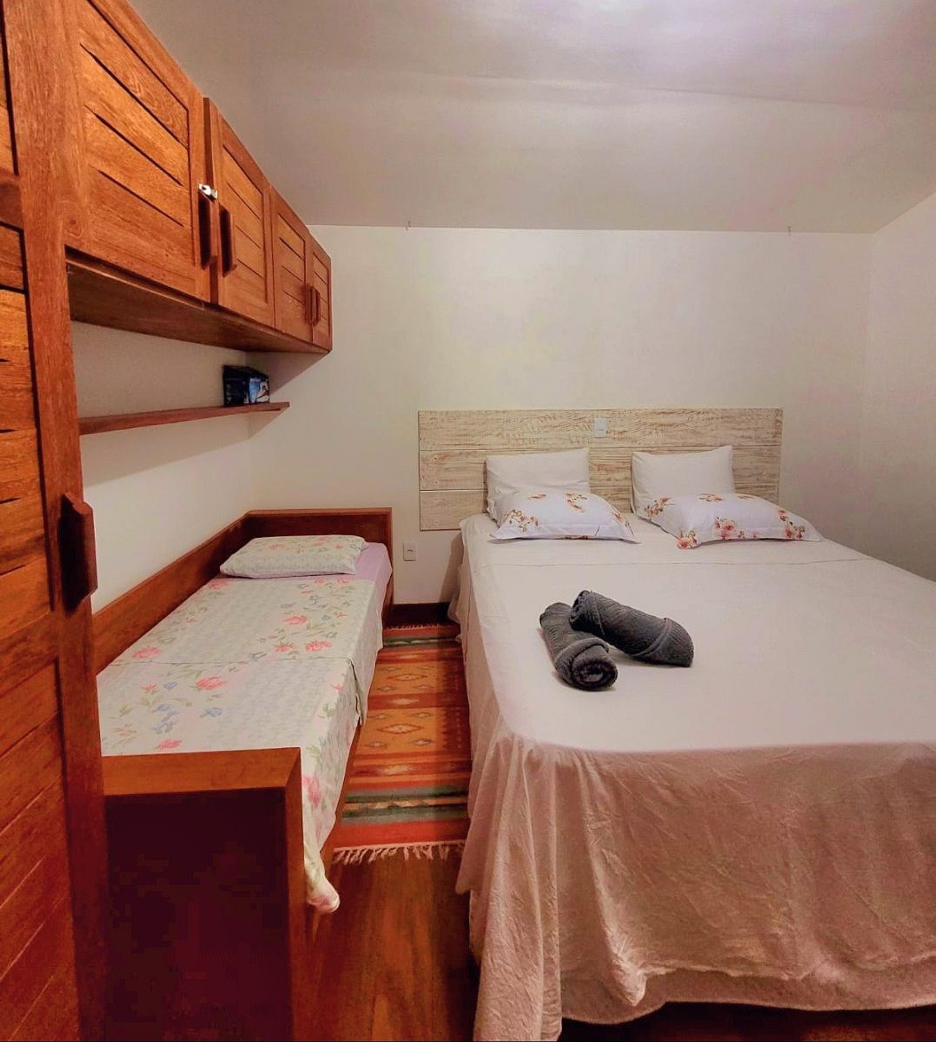 Quarto 1: possui cama casal com mais uma cama de solteiro.
